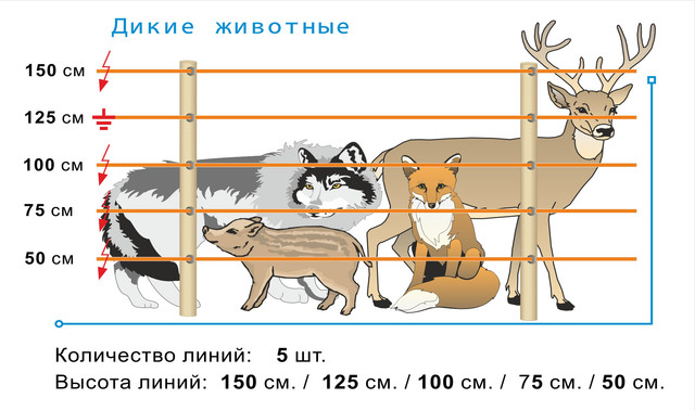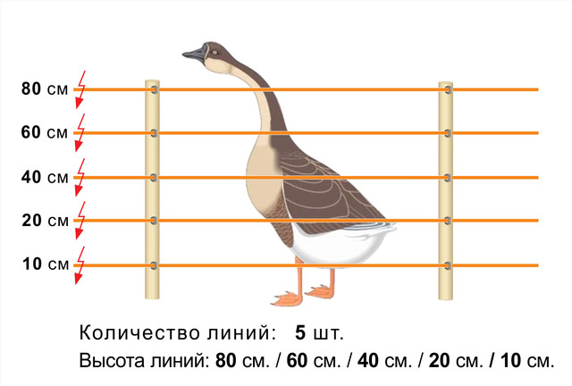 Принцип роботи і схеми розташування провідників електроогорожі див. нижче